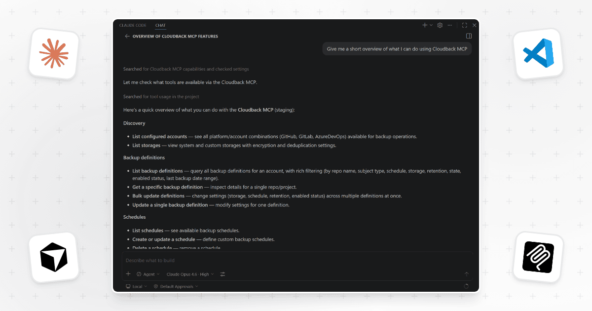 Cloudback now ships an official Model Context Protocol server that plugs the Cloudback Operations API directly into the AI assistants platform engineers already use. With the MCP server running, Claude Code, Claude Desktop, Cursor, VS Code, and any stdio MCP-compatible client can read and modify backup configuration across GitHub, GitLab, Azure DevOps, and Linear accounts through plain-language chat. It's a practical hook for the 14k+ repositories secured and 4M+ backups created that Cloudback customers depend on.